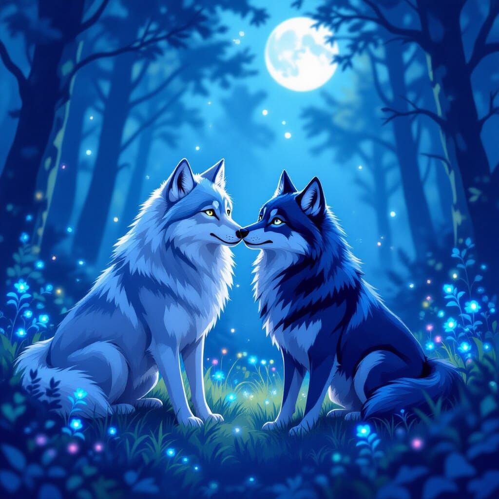 This digital painting depicts two wolves, one light blue and one dark blue, interacting playfully in a mystical forest clearing under ethereal moonlight. It features vibrant colors and captivating character designs.