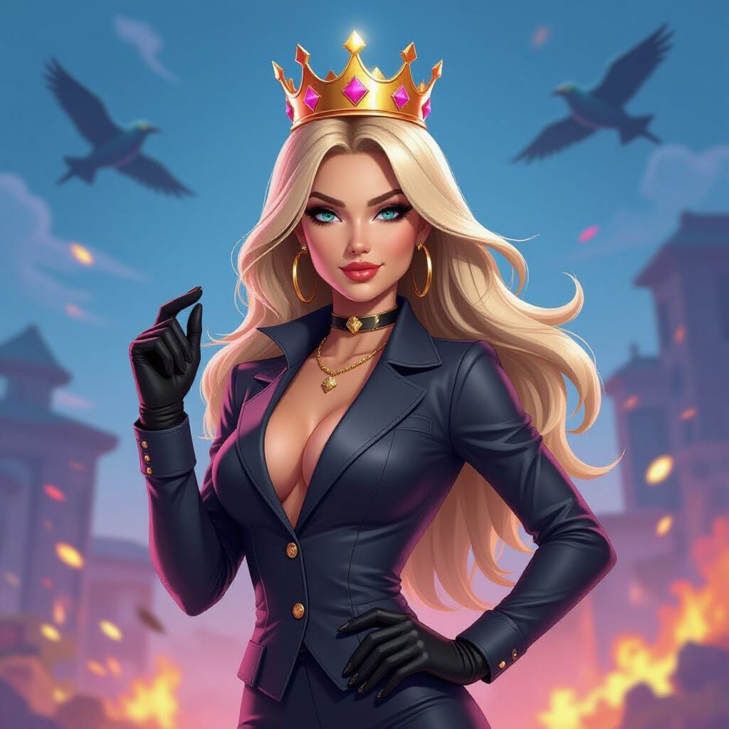 This image features a beautiful blonde woman with long hair and a shiny crown, posing dynamically in a colorful, action-packed scene reminiscent of a Fortnite game. The image is digital art with a stylized aesthetic.