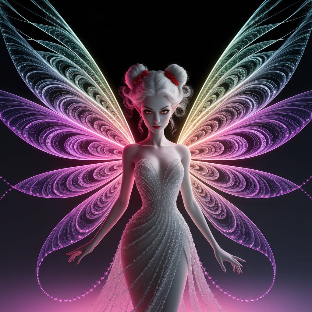 This image shows a fairy with porcelain skin, red hair and gossamer wings. The wings feature swirling fluorescent patterns. The artwork blends surreal pointillism with vibrant digital art textures.