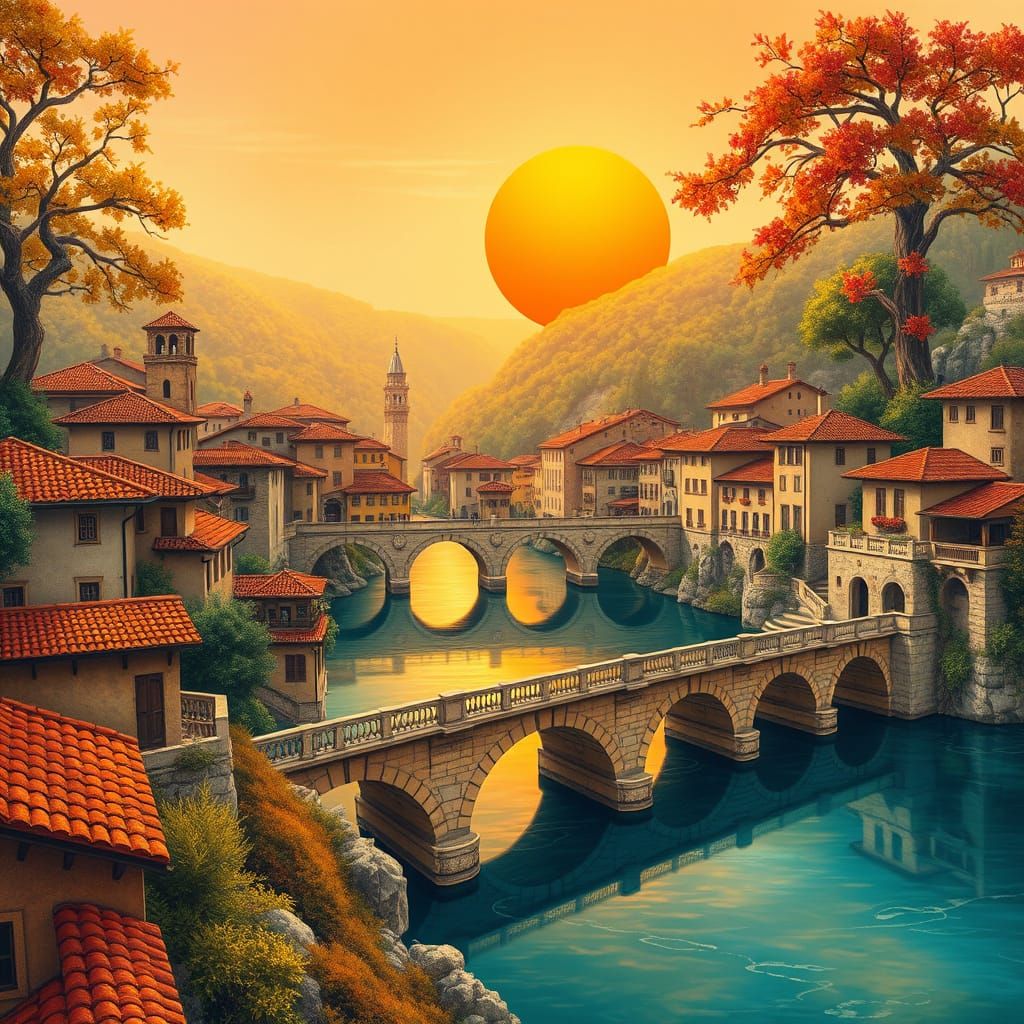This image depicts a picturesque town with terracotta-tiled rooftops and warm, golden buildings, surrounded by serene waters, arched bridges, and lush trees with multicolored leaves in a detailed, dreamlike style