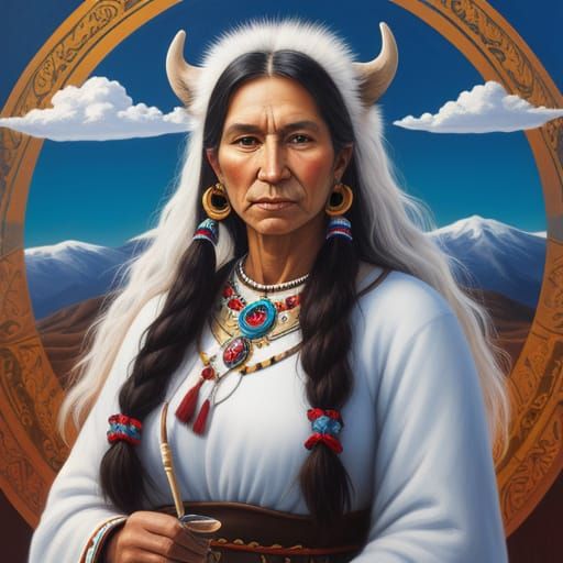 This image shows White Buffalo Calf Woman presenting the sacred pipe. A stunning depiction of this important spiritual figure, rendered as a paint masterpiece.