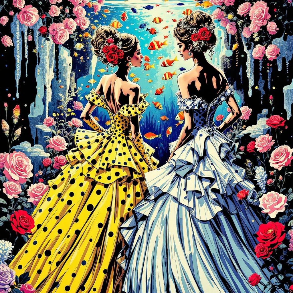 A vibrant pop art scene featuring two princesses in ball gowns by a reef aquarium. The image uses bold Ben-Day dots and primary colors in a satirical style.