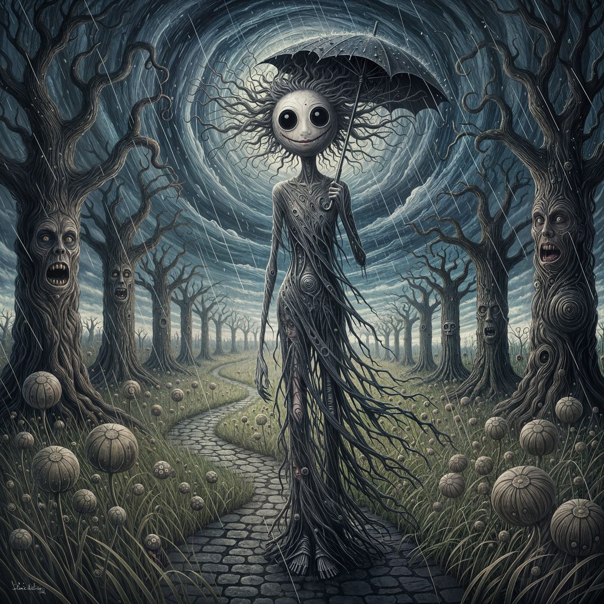 This image depicts a figure with dark eyes and wild hair holding an umbrella in a rainy landscape. The scene blends whimsical chaos with horror elements, rendered in a detailed, oil-painting style.