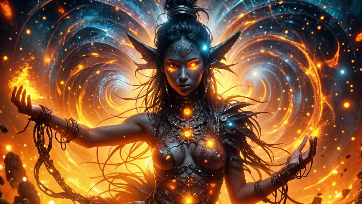 This striking portrait captures an alien shaman performing a fire dance. Created as detailed concept art with dynamic lighting and vibrant colors.