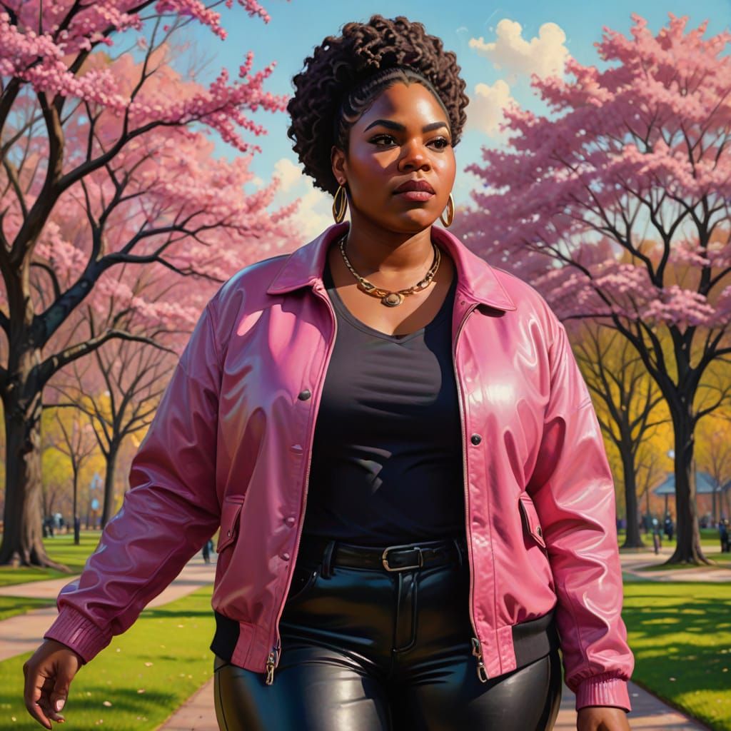 This image shows a vibrant portrait of a plus-size African-American woman in a pink jacket and black pants, standing in a park. The piece features an oil painting style, with intricate details and soft, dramatic lighting.