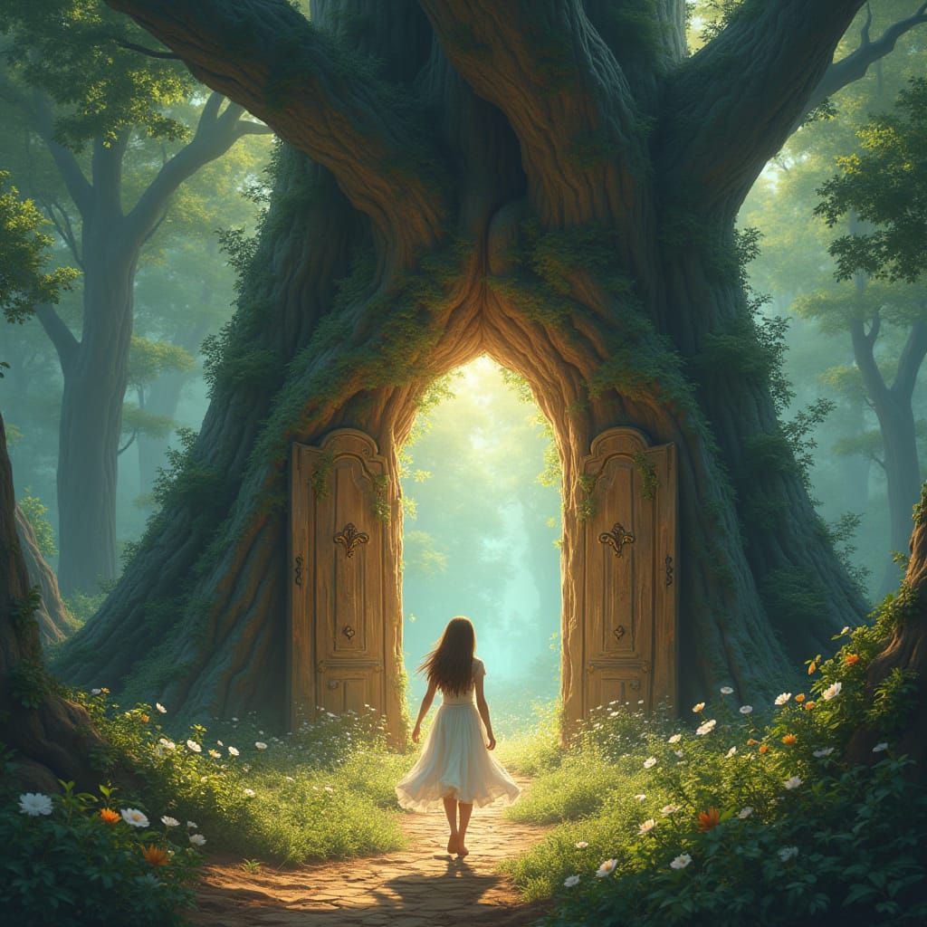 A young woman in a white dress walks through a colorful forest towards a huge tree. The tree opens to reveal a portal to another world, in a digital matte painting style.
