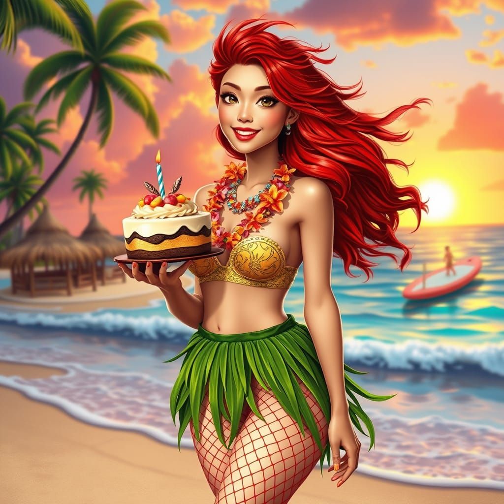 This image shows a young Asian woman in festive attire on a Hawaiian beach, holding a birthday cake. Rendered in a vibrant candy art style, it has hyperrealistic details, dynamic lighting and cel-shaded textures.