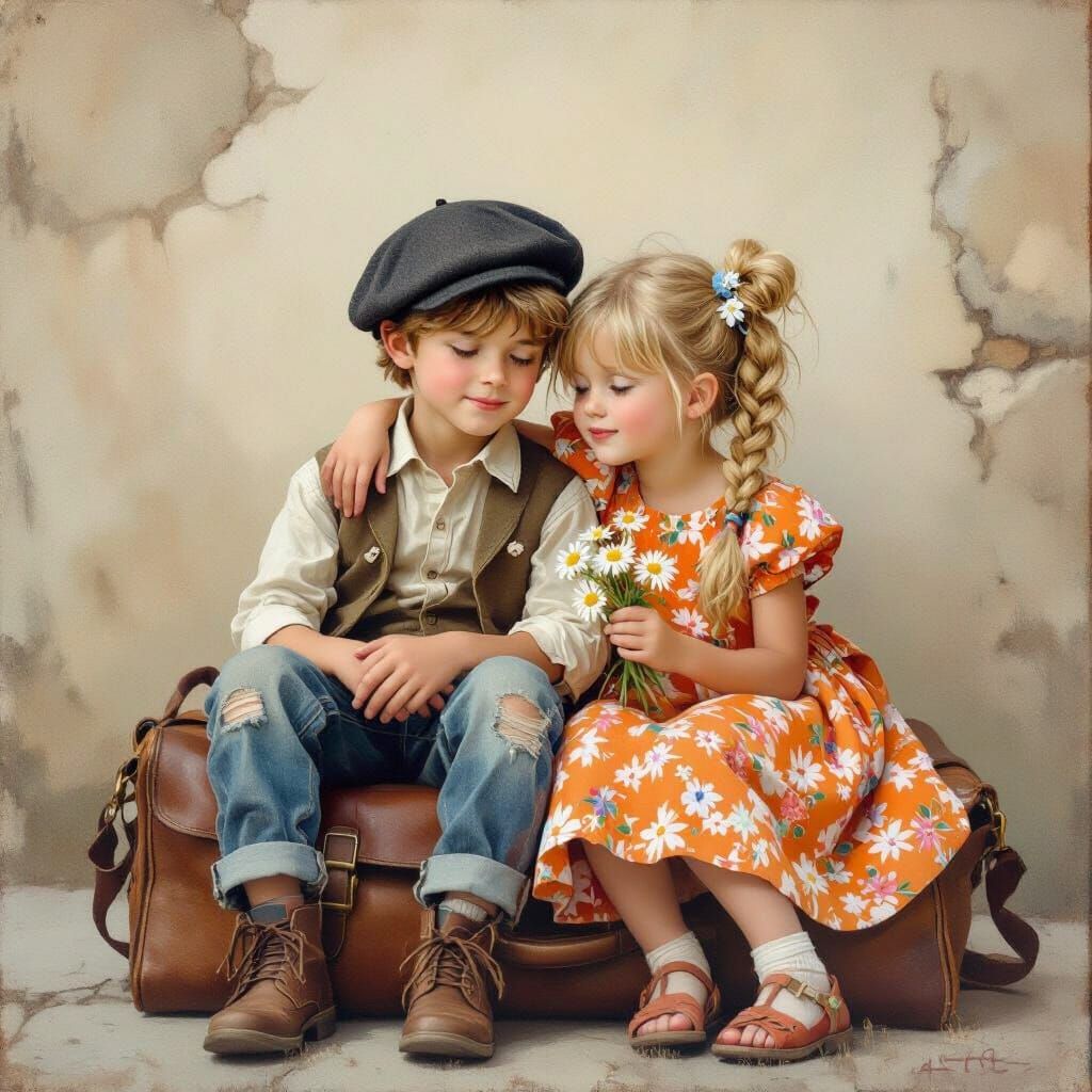This image shows two children resting on an old suitcase, bathed in soft light. The boy wears a beret and vintage clothes, while the girl is in an orange floral dress holding chamomile flowers, in a nostalgic mixed media style.