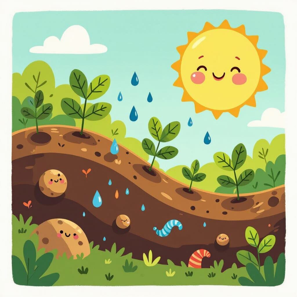 This image shows a cartoon landscape under a baby blue sky. A smiling sun shines down on cartoon plants in bouncy soil, with happy worms and teardrop-shaped water drops. The art style features bold lines and vibrant colors.