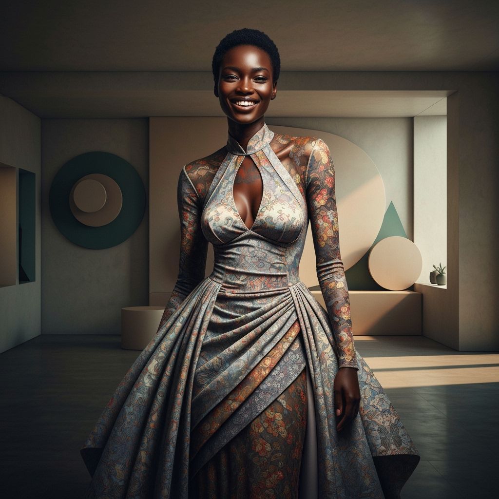 A striking picture of a smiling, dark-skinned woman in abstract clothing. The image features dramatic lighting and a modern interior, rendered in a photorealistic style with elements of abstract expressionism.