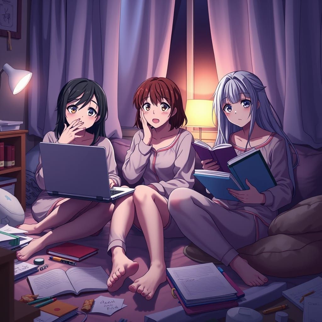 This image depicts three anime-style college girls in a cozy dorm room at night, surrounded by scattered notebooks, snacks, and a glowing desk lamp. The girls' shocked and panicked expressions add to the frantic yet cute atmosphere, showcasing a detailed and aesthetic scene.