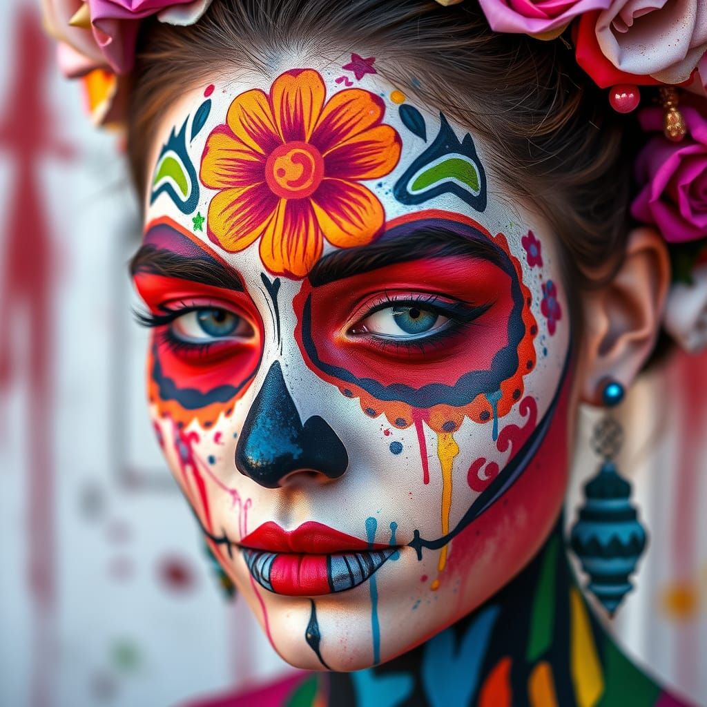 This image shows a beautiful woman with vibrant Día de los Muertos face paint. The artwork is reminiscent of street art, utilizing high contrast and a colorful polychromatic palette.