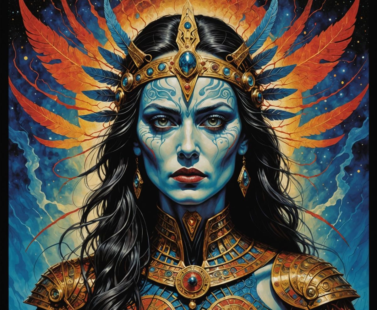 A psychedelic portrait of a warrior woman. This hyperdetailed and photorealistic image showcases surreal art styles with elements reminiscent of visionary and science fiction art.