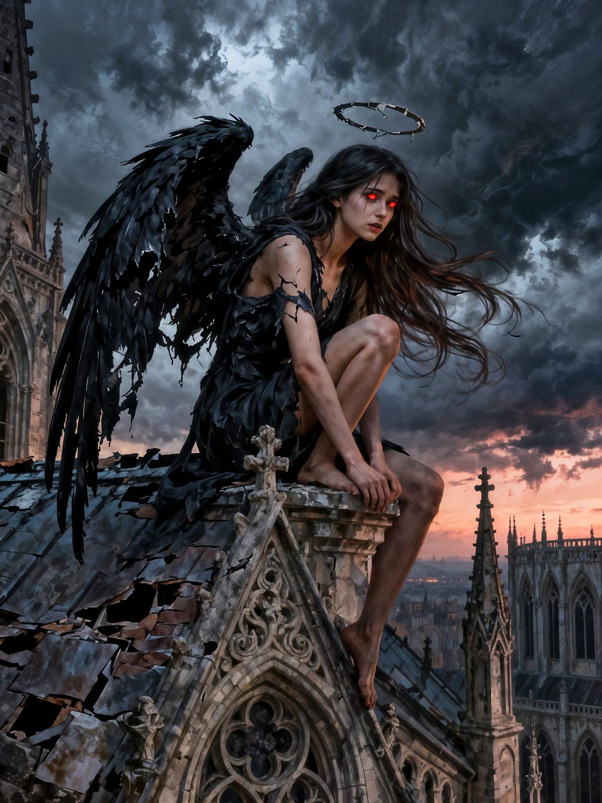 This image depicts a fallen angel with torn wings on a gothic cathedral at dusk. The scene features dramatic lighting, intricate details, and a melancholic atmosphere, rendered in a painterly fantasy art style.