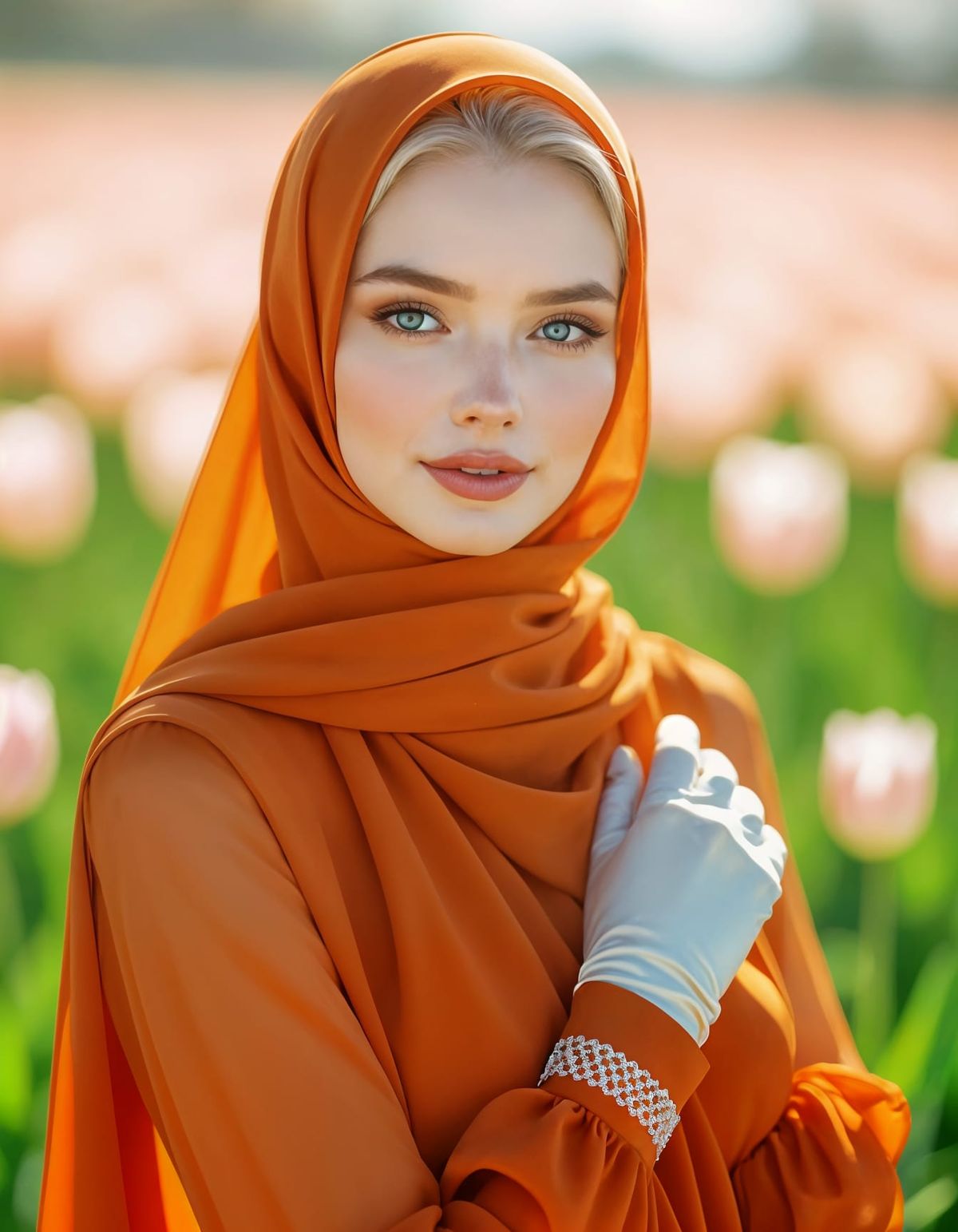 This image shows a beautiful 26-year-old Dutch woman with pale skin and blue eyes, wearing an orange chiffon dress, hijab, and satin gloves, with a blurry tulip garden background.