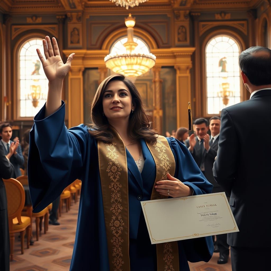This image shows a young woman in a blue business suit, holding her certificate and waving to her husband, as people applaud her in a grand, ornate graduation hall with warm, golden lighting and precise details, reminiscent of realistic art styles.