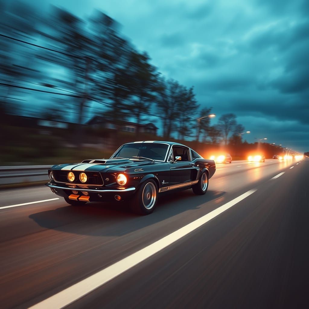 This image captures a 1967 black Ford Mustang Shelby Eleanor GT500 speeding down a highway at night. Shot with a DSLR camera, it features professional photography with bokeh and natural lighting.