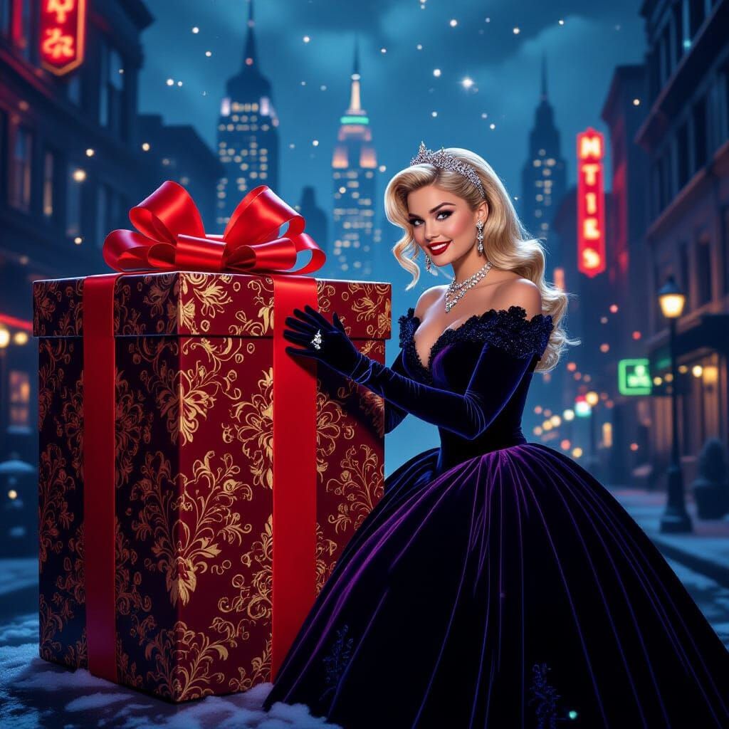 A captivating image showing Sabrina Spellman in a festive velvet dress, playfully posing with an oversized gift. The artwork evokes a vintage comic book style, with hyperrealistic details and cinematic lighting against a misty cityscape.
