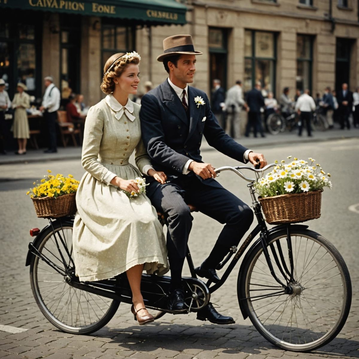 This image depicts a couple joyfully riding a bicycle built for two, inspired by a classic song. The scene evokes a sense of whimsical romance and simple happiness.