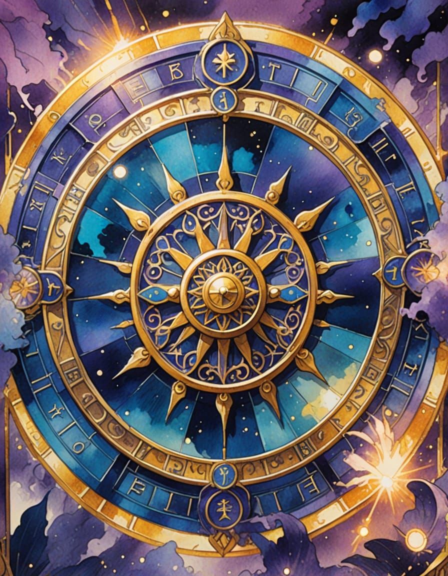 This image shows a tarot card illustration of the Wheel of Fortune in a watercolor anime style. The vibrant, cel-shaded image features golden light shining through mist, with deep blues and purples.