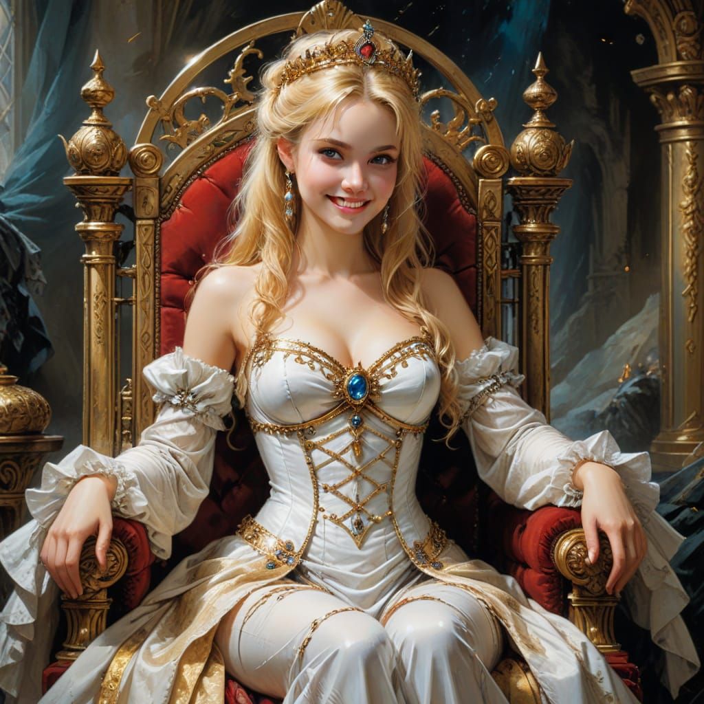 A digital portrait of a beautiful blonde princess smiling while seated on an ornate throne. The image is rendered with vibrant colors in a fantasy art style.