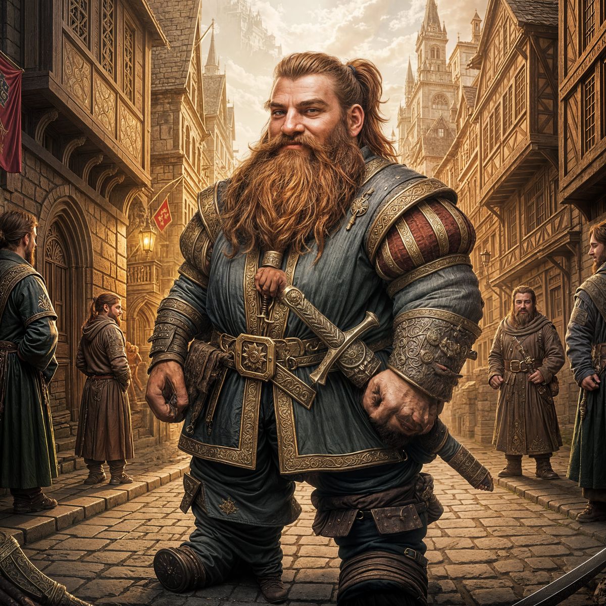 This image shows a confident young dwarf standing in a vibrant medieval city street, dressed in fine clothing and adorned with gold rings, as seen in the style of classic warhammer art