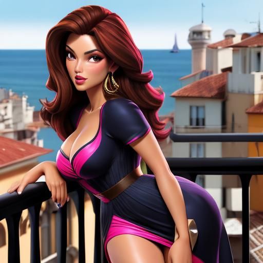 This image features a stunning woman in a revealing party dress, posing on a balcony with a confident and sensual attitude. Her brown hair is styled with vibrant pink and blue highlights, accentuating her curvaceous figure and striking beauty.
