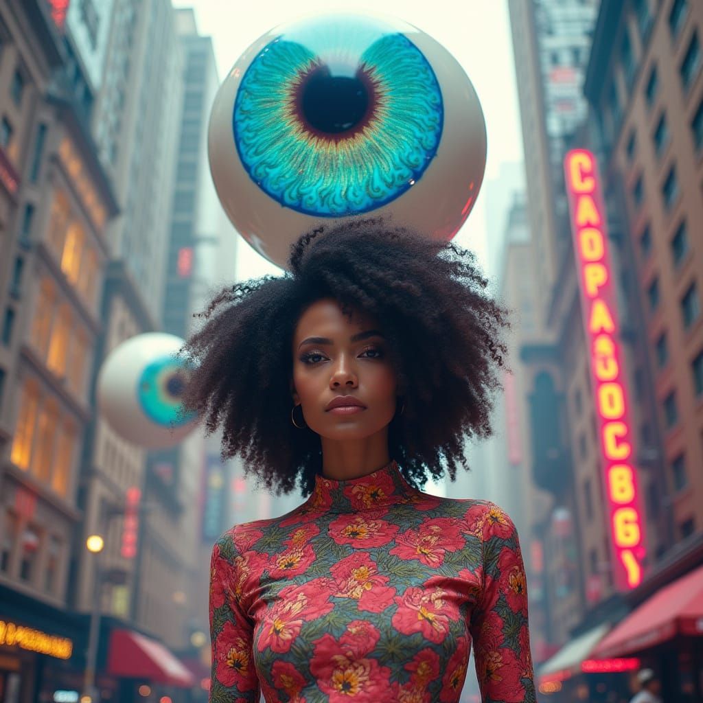 This image shows a stunning woman amidst a vibrant cityscape, surrounded by towering skyscrapers and glowing neon signs, with giant, iridescent eyeballs hovering above, blending dreamlike colors and retro-futuristic flair.