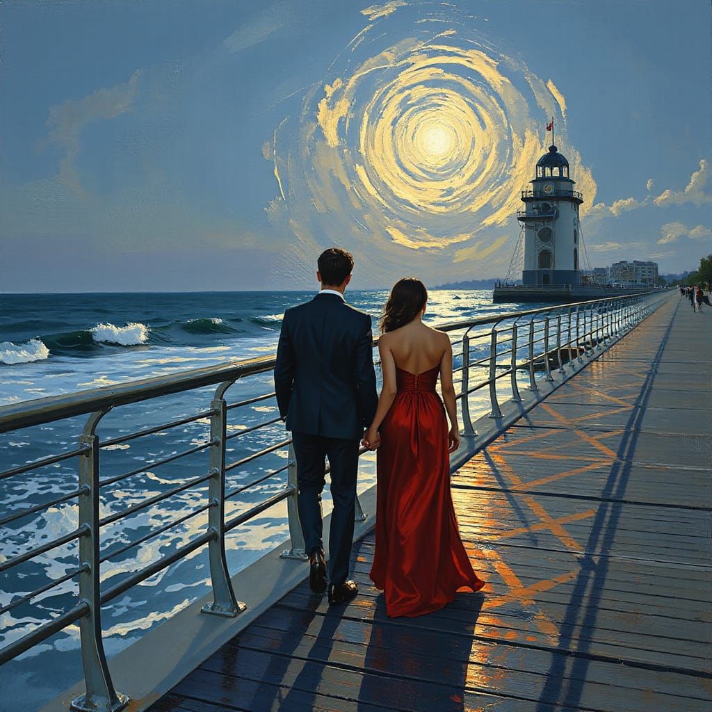 This image shows a couple walking on a boardwalk at night. Gentle waves crash on the shore under the moonlight, rendered in a gouache style similar to impressionist paintings with thick, textured brushstrokes.