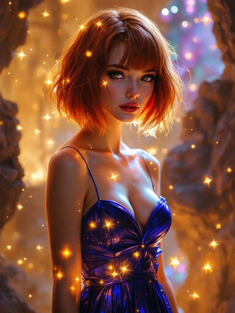 This image shows a redhead woman in a blue dress making direct eye contact. The piece blends hyperrealism with luminous, atmospheric glow to create a tranquil yet profound aesthetic.