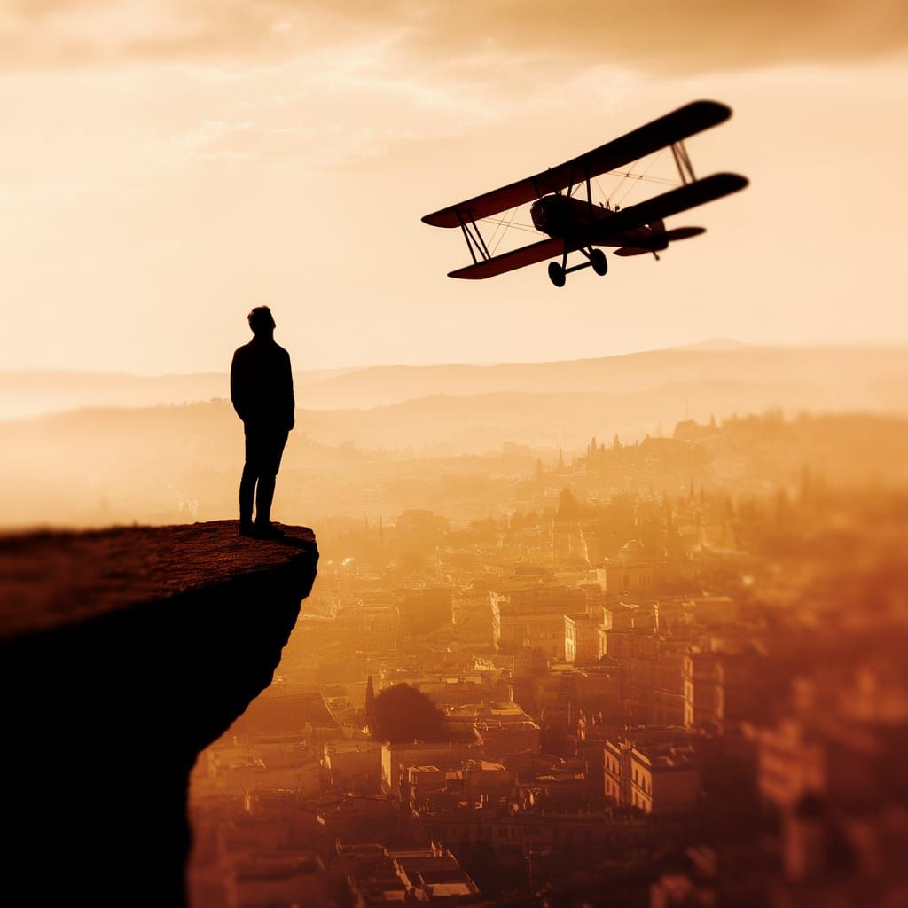 This image captures a lone figure gazing at a vintage biplane above an ancient city at sunset. The scene evokes wistful contemplation and hope for the future.