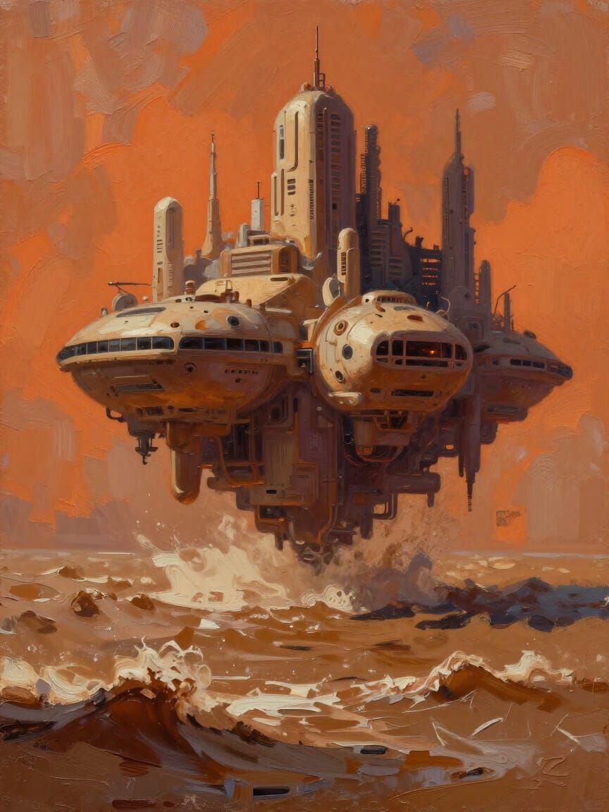 Solar Vintageworks, orange amber rust sandstone clay burnt_umber, Spectrum Studio, Retro-Futurism floating technological city on an a muddy ocean, dirty waves crashing, impasto-rich image with heavy brushstrokes and deep shadows, ominous lighting, deep shadows, deep focus,