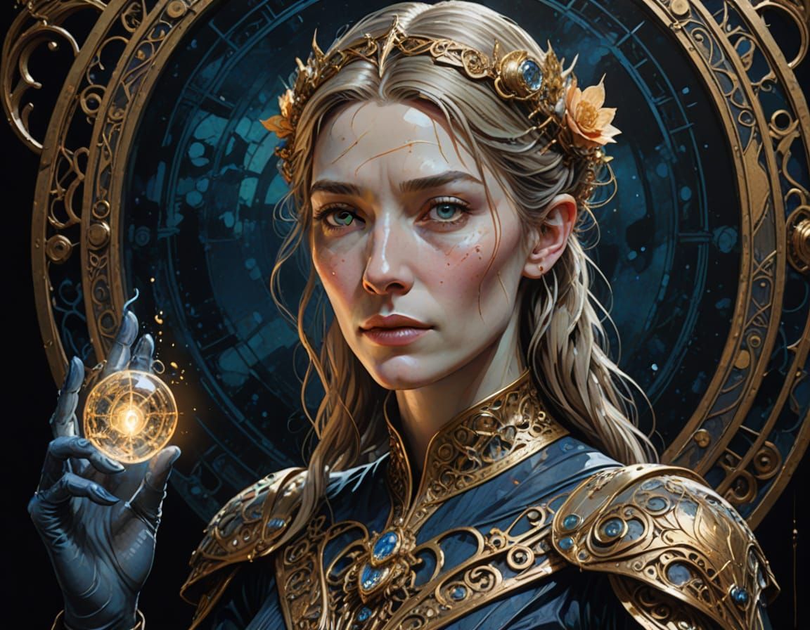 This image depicts a serene scene of Galadriel, inspired by the elegance of Art Deco, with intricate details and soft focus. She holds a glowing phial, surrounded by a whimsical environment with vibrant hues and complementary colors.