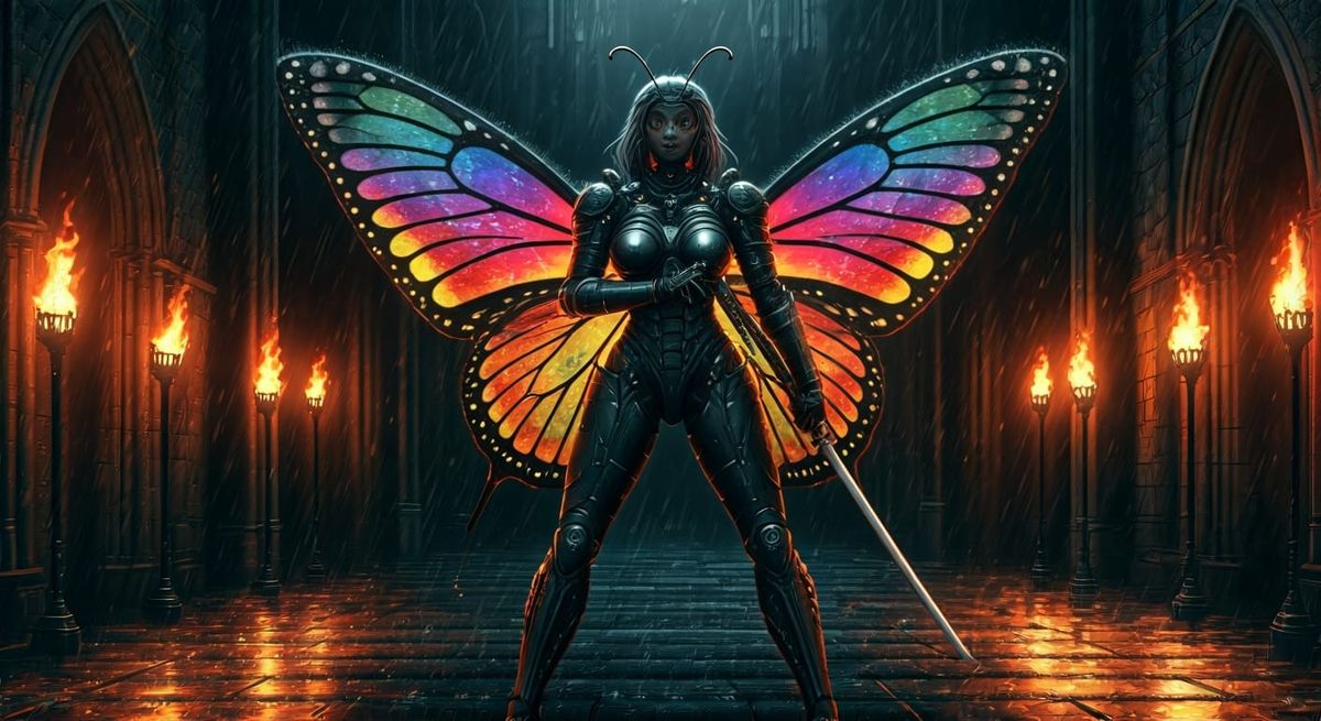 A vibrant image of a confident, bipedal butterfly woman in black power armor, holding a katana in rain-soaked ruins. The artwork features intricate mechanical details and a futuristic, biomechanical aesthetic.