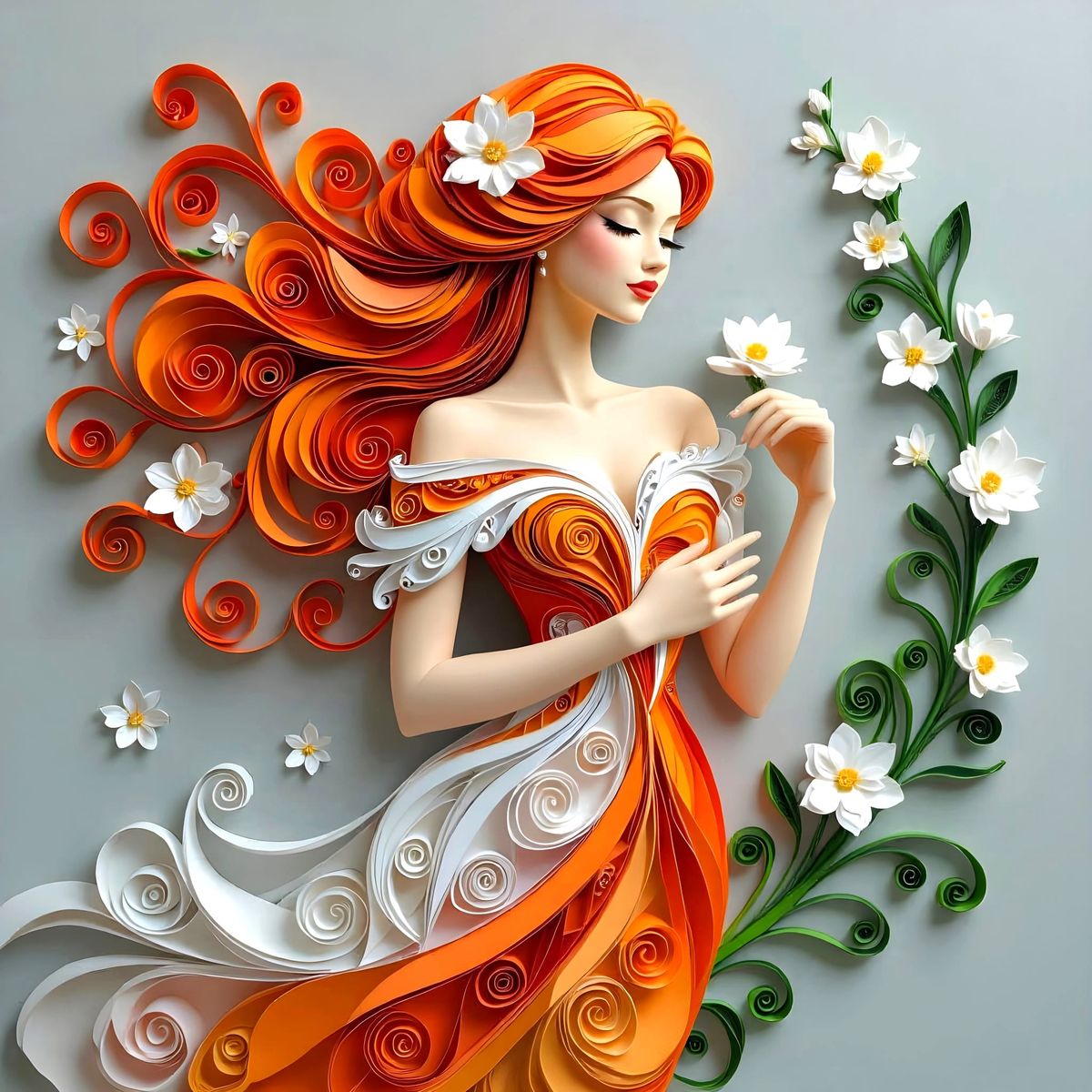This image showcases a detailed quilling art portrait of a woman with flowing orange paper hair and a dress of orange and white spirals, holding flowers amid swirling vines.