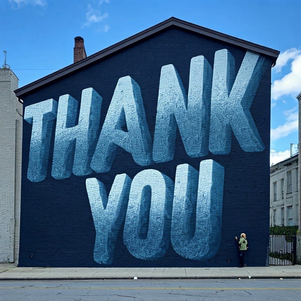 A stunning city mural depicts a giant, bold 'Thank You' on the side of a building, showcasing a beautiful and eye-catching artistic masterpiece.