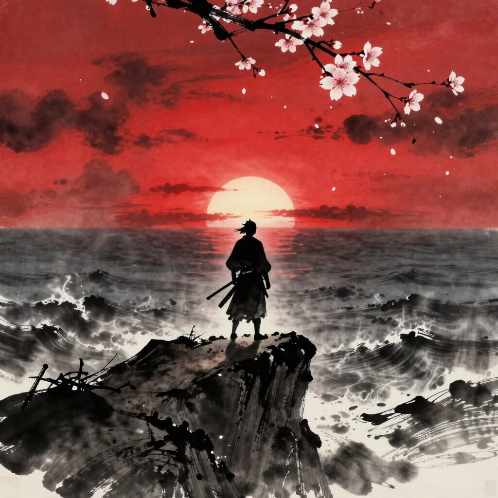 This image depicts a solitary samurai warrior on a cliff edge facing a stormy sea at sunset, rendered in a sumi-e ink wash style with dramatic, calligraphic lines.