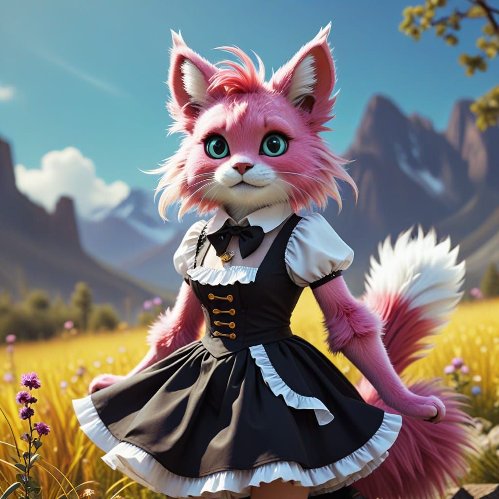 This image depicts a happy furry woman-beast in a maid outfit. The artwork blends fantasy and science fiction elements with retro colors and a future punk aesthetic.