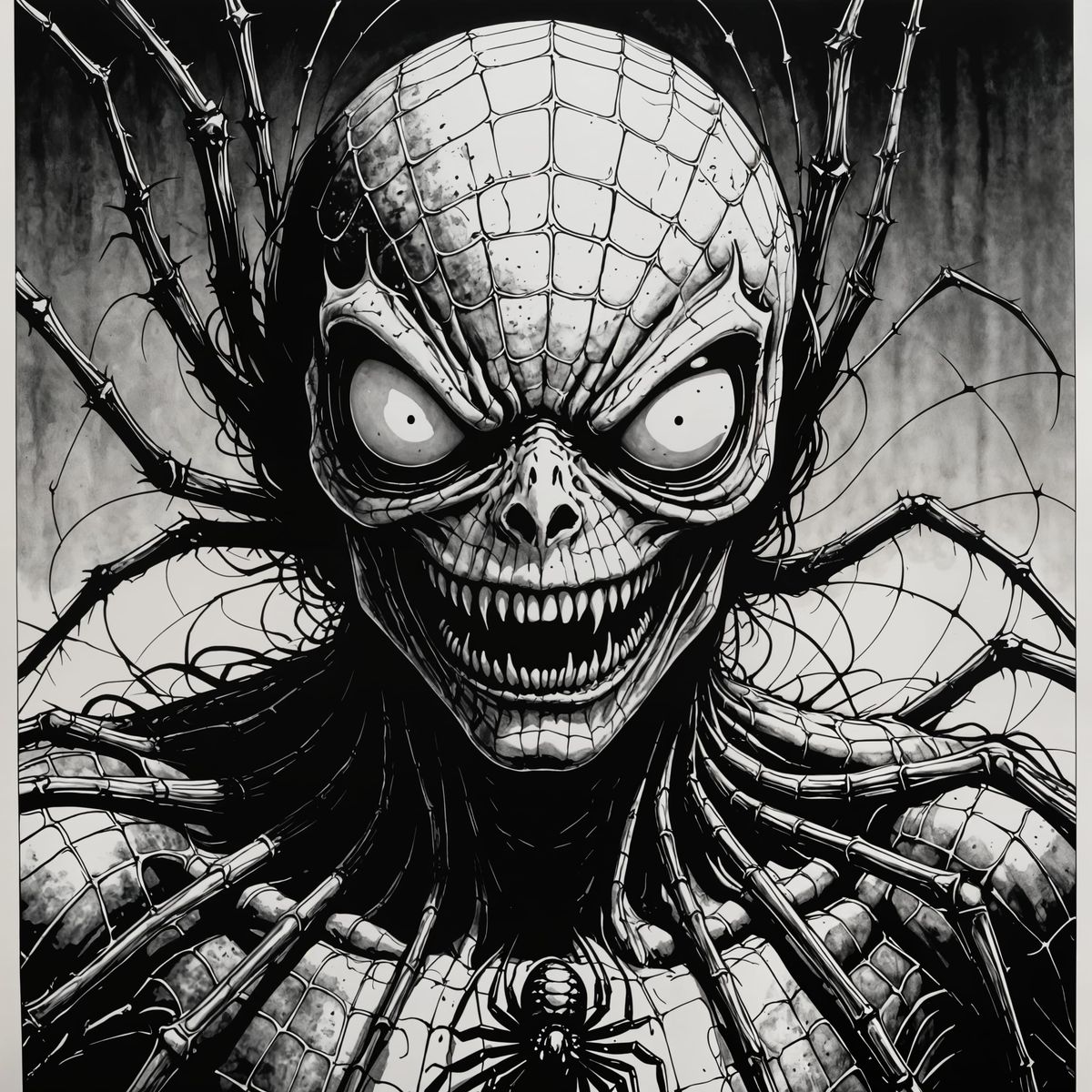 This image features a terrifying spider in a detailed ink on paper manga style, evoking a masterpiece of horror art. The artwork emphasizes intricate linework and dark themes.