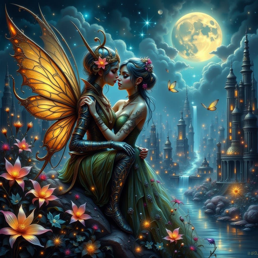 A steampunk-inspired image of fairies kissing in a futuristic cityscape. The artwork features cinematic lighting and a flat, cel-shaded style, with hyperdetailed textures and deep colors in a manga style.