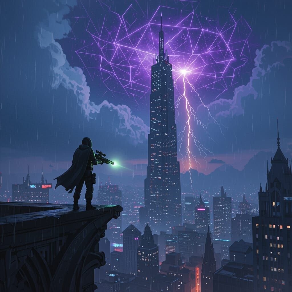 This image shows a lone figure on a skyscraper gargoyle overlooking a rain-slicked city. Above, a solid barrier of light with geometric patterns seals the sky, while a massive spire catches magical lightning.