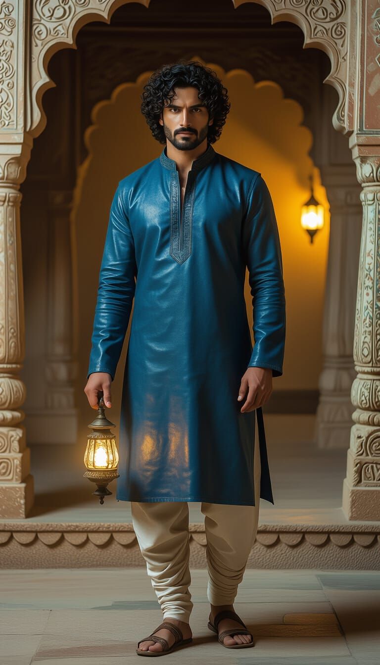 This image shows a man in an ancient kurta holding a lamp in a dimly lit haveli at night. The cinematic style creates a dark, mysterious atmosphere enhanced by subtle lighting.