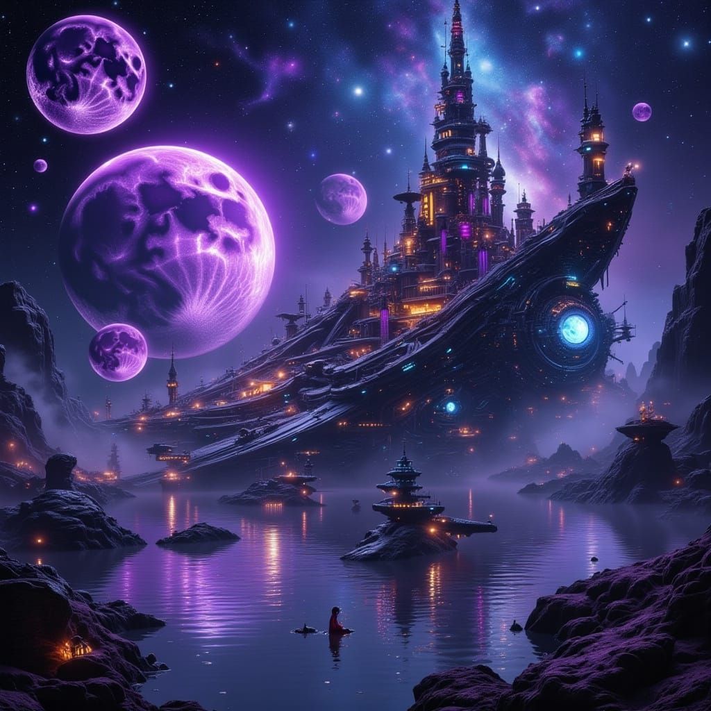 This image showcases a vast, futuristic city constructed from fused starships in deep space. Shimmering glass and radiant metal structures are set against the Andromeda nebula, reminiscent of hyperrealist art.