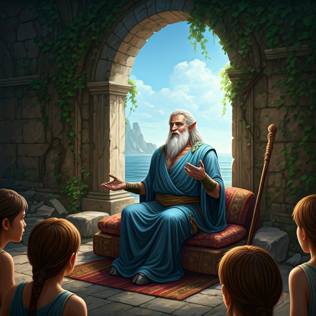 This image shows an elderly male centaur, adorned in a blue chiton, seated beneath a weathered arch. He captivates a youthful audience with stories of battles and gods.