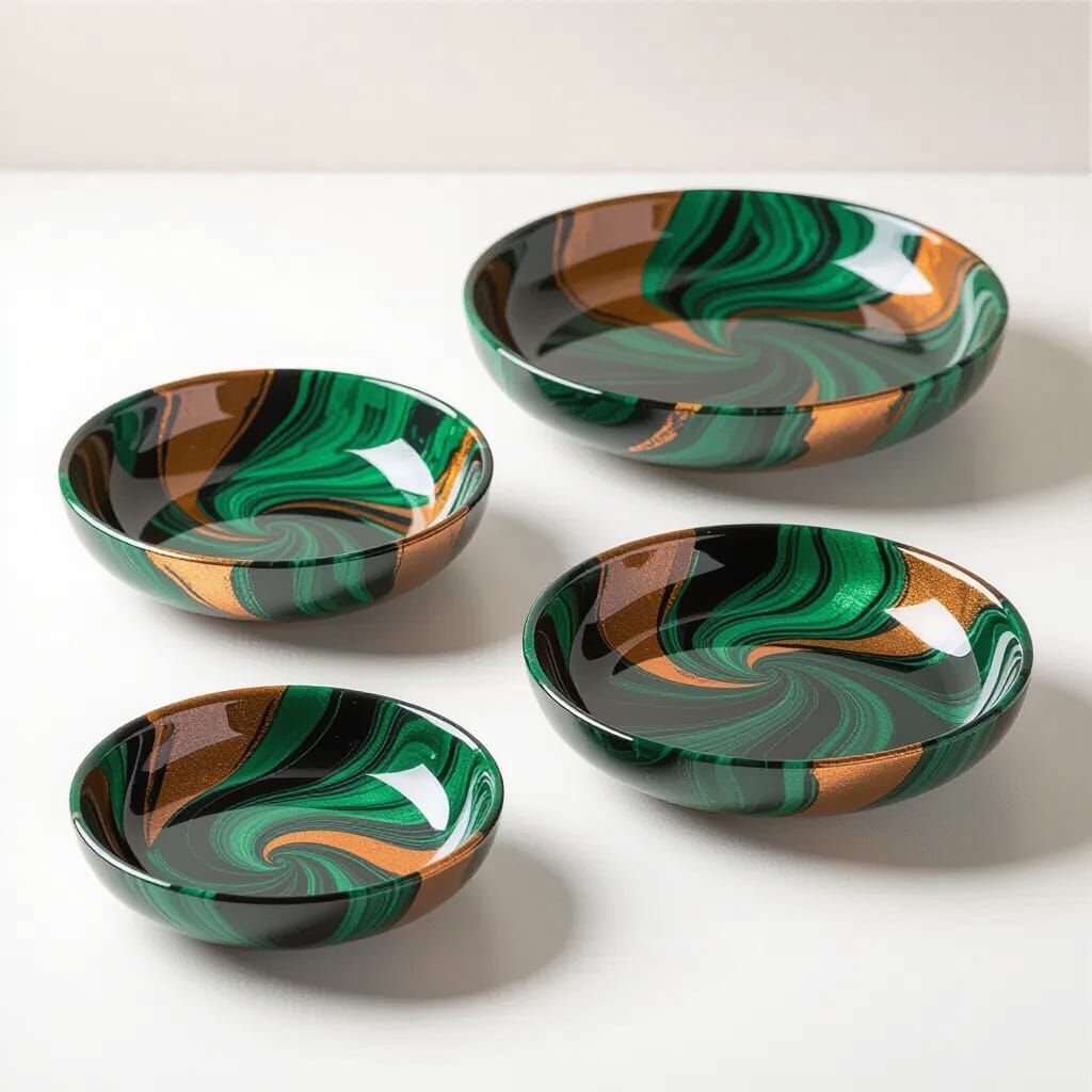 Discover premium resin trays, bowls, and platters showcasing a luxurious swirling marble pattern in emerald green, copper, and black. These pieces feature a glossy finish and opulent textures.