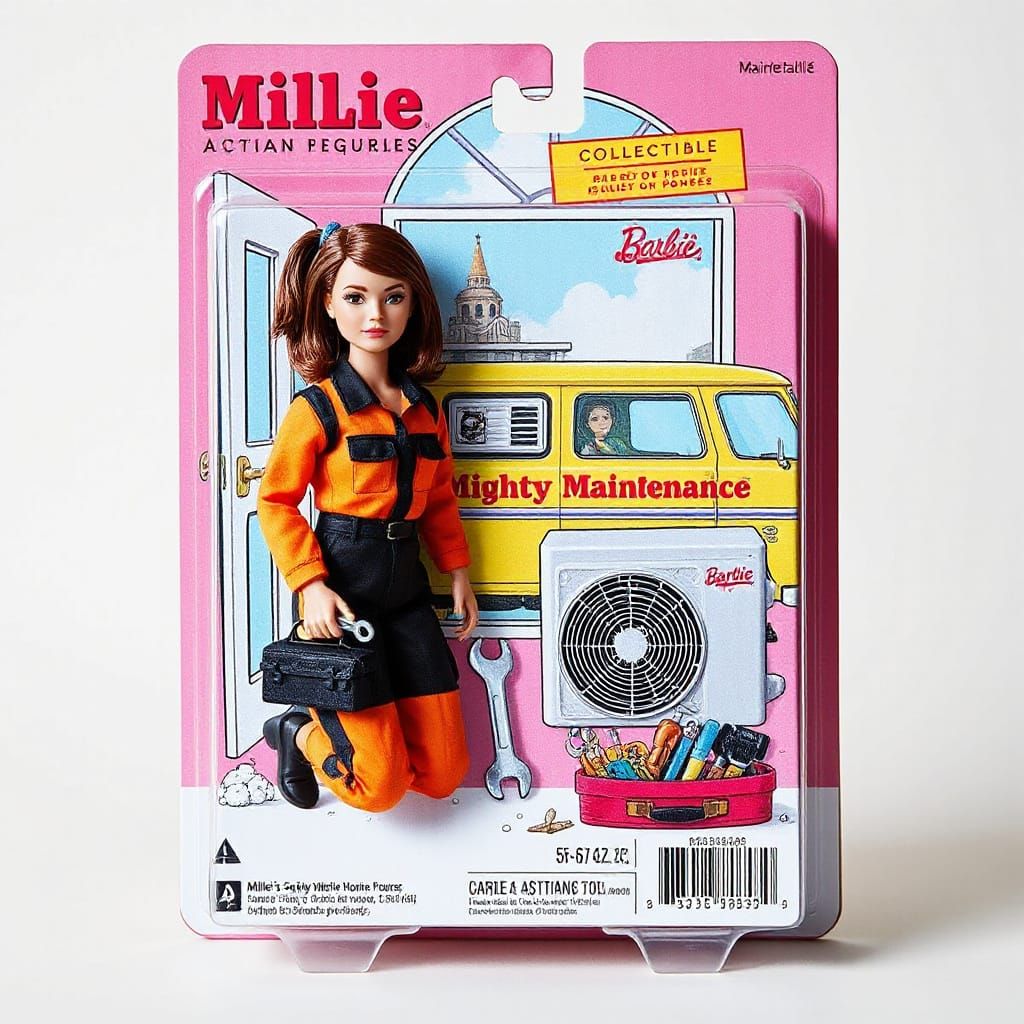 This collectible action figure box features a dynamic illustration of Maintenance Millie in a stylized section of the Barbie Dream House, surrounded by bright pastel colors, bold graphics, and clean lines. The clear plastic blister pack showcases the figure and accessories in a miniature scene.