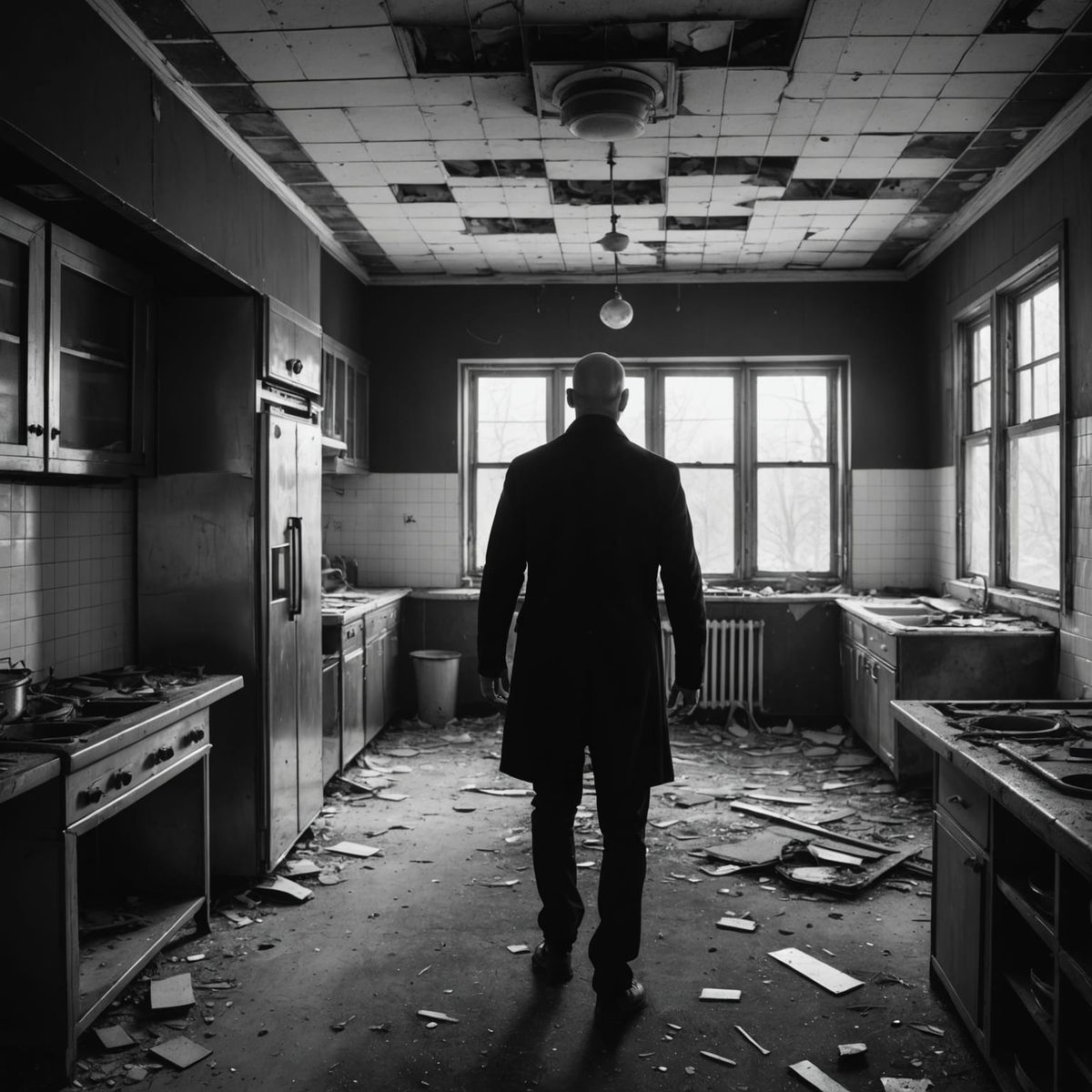 This image shows a bald man in black walking through a ruined hotel kitchen. The black and white photorealistic image is intricately detailed, mysterious, and ominous.