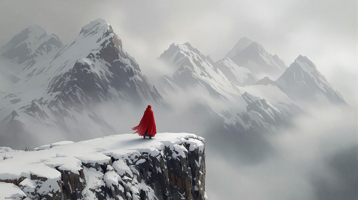 This image is an atmospheric impressionistic painting of a lone figure in a crimson cloak standing on a snowy cliff edge amidst misty mountains, evoking a sense of grandeur and isolation.