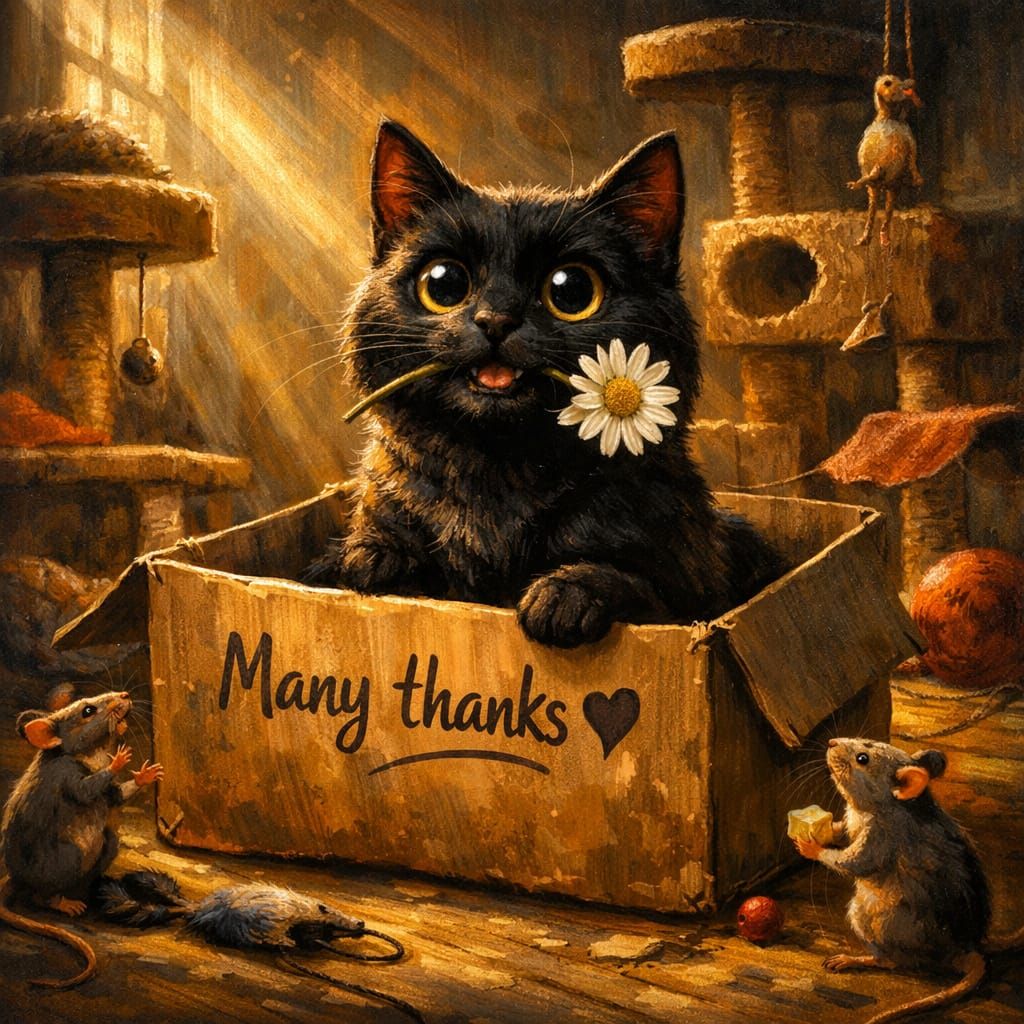This image shows a humorous black cat with wide eyes and a flower, sitting in a box labeled 'Many thanks'. The background is a detailed cat room. Rendered in an epic fantasy illustration style with dramatic lighting.