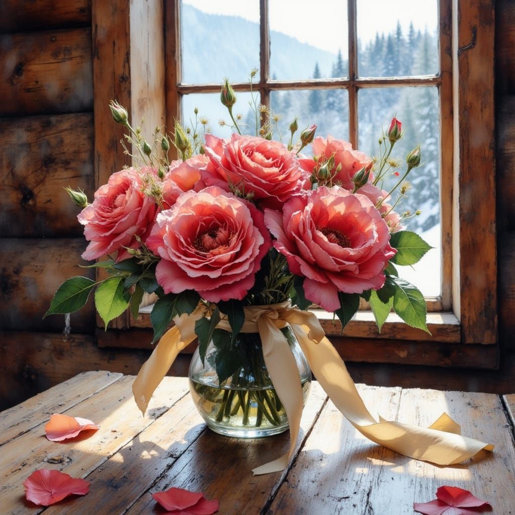 This image showcases detailed watercolor roses, dusted with silver, resting on an aged wooden table. A satin ribbon ties them together, with ambient light creating a vibrant, colorful reflection.